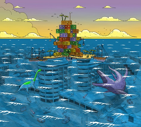 Il fascino del Grand Hotel offre la cornice ideale per l’esposizione “Rimini sommersa” con le opere fantascientifiche di Samuele Grassi, illustratore riminese tra i protagonisti della quarta edizione della Biennale del Disegno di Rimini fino al 28 luglio, diretta da Massimo Pulini. La “Rimini sommersa” di Samuele Grassi è una città allagata, un’Atlantide a metà, dove parte delle costruzioni ancora affiorano in superficie, mentre la base dei monumenti e delle strade è abitata da creature preistoriche o mostruose, per effetto di un disgelo globale, un futuro distopico dove la catastrofe è resa nella leggerezza divertente del fumetto. Sopra e sotto la superficie dell’acqua si possono intravedere le costruzioni identitarie della città, come il Tempio Malatestiano, il ponte di Tiberio o elementi della nostra storia balneare e contemporanea quali il Rock Island o il centro Flaminio. Dal suo luogo natale, che sarà oggetto della mostra, l’artista riminese ha recentemente avviato un itinerario italiano di città sommerse, in un ideale viaggio fantastico tra passato e futuro, tra storia e immaginazione.