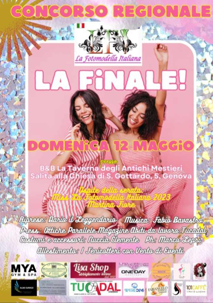 Domenica 12 maggio, a Genova, alle ore 15, negli spazi del B&B La taverna degli antichi mestieri (Salita alla Chiesa di San Gottardo 5), andrà in scena la finale regionale Liguria del concorso nazionale “La Fotomodella Italiana” by Andrea Giannetto e Wilmer Lanfredini.