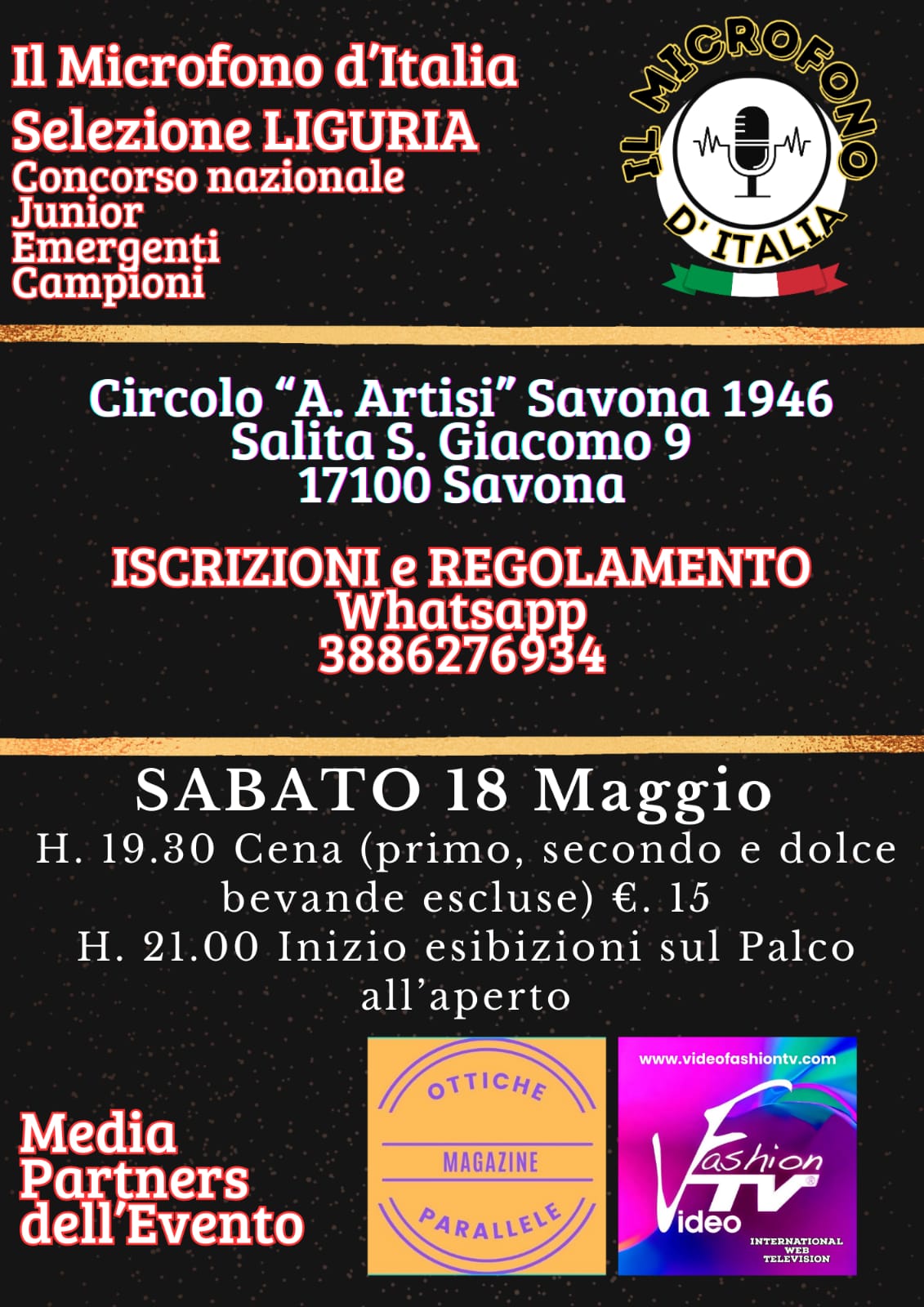 Sabato 18 maggio, alle ore 21, sul palco del Circolo “A.Artisi” Savona 1946 di Savona (Salita S. Giacomo 9) avrà luogo la prima selezione per la regione Liguria del concorso canoro nazionale “IL MICROFONO D’ITALIA”, evento ideato e organizzato da Samuel Accomo dell’agenzia alessandrina SAAS – Organizzazione Eventi – Management Artisti.