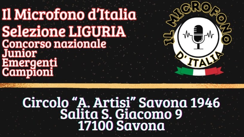 Sabato 18 maggio, alle ore 21, sul palco del Circolo “A.Artisi” Savona 1946 di Savona (Salita S. Giacomo 9) avrà luogo la prima selezione per la regione Liguria del concorso canoro nazionale “IL MICROFONO D’ITALIA”, evento ideato e organizzato da Samuel Accomo dell’agenzia alessandrina SAAS – Organizzazione Eventi – Management Artisti.