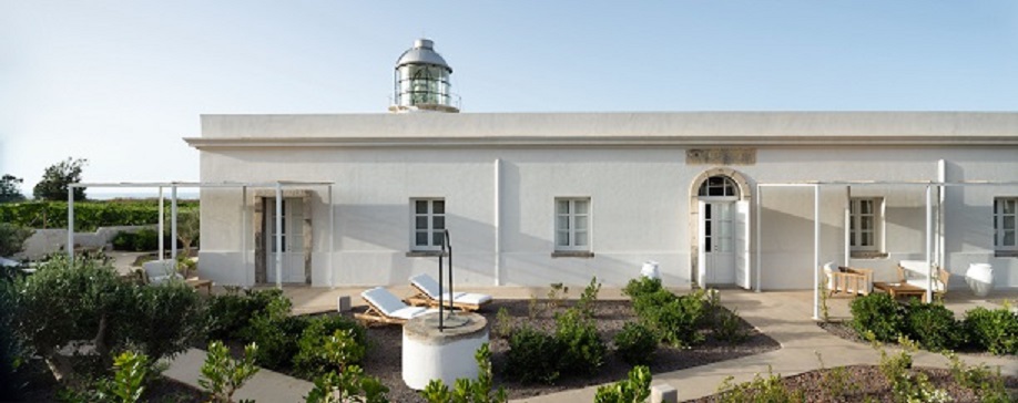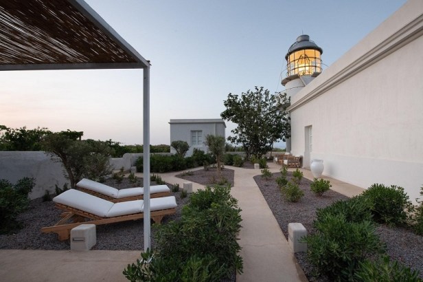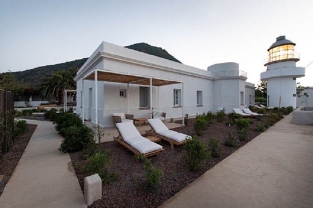 Gli architetti Floriana Marotta e Massimo Basile hanno lavorato anche sull’area paesaggistica di pertinenza del Faro, e scegliendo di valorizzare il genius loci hanno attinto alla ricchezza dell’isola, dando forma a muretti a secco, vialetti in brecciolino vulcanico locale, cannicciati sorretti da esili strutture che ombreggiano con discrezione i giardini privati delle suite.