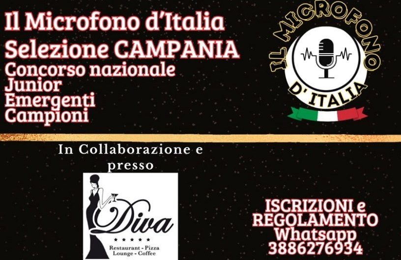 Venerdì 31 maggio, alle ore 21, il Diva Lounge Bar di Giugliano in Campania (Via Prolungamento Pigna 33), provincia di Napoli, ospiterà l’appuntamento con le selezioni del concorso nazionale “IL MICROFONO D’ITALIA”, evento ideato e organizzato da Samuel Accomo dell’agenzia alessandrina SAAS – Organizzazione Eventi – Management Artisti.