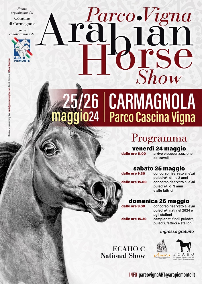 Il 25 e 26 maggio 2024 presso il Parco Cascina Vigna a Carmagnola (TO) si svolgerà un evento d’eccezione, il primo Concorso Nazionale di Morfologia dedicato al Cavallo Purosangue Arabo intitolato Parco Vigna Arabian Horse Show, organizzato dal Comune di Carmagnola e dall’Associazione Regionale Allevatori del Piemonte (ARAP), con l’affiliazione dell’ANICA (Associazione Nazionale Italiana del Cavallo Arabo) e dell’ECAHO (European Conference of Arabian Horse Organization).