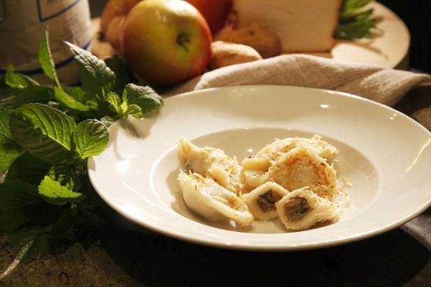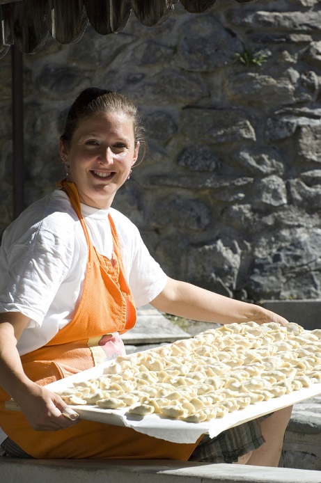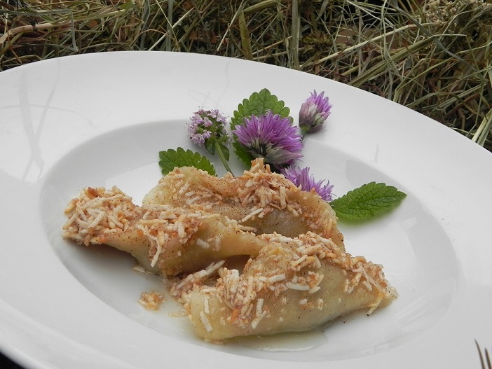 Tocco finale, il condimento: una semplice spolverata di scuete fumade (ricotta affumicata) e ont (burro fuso).