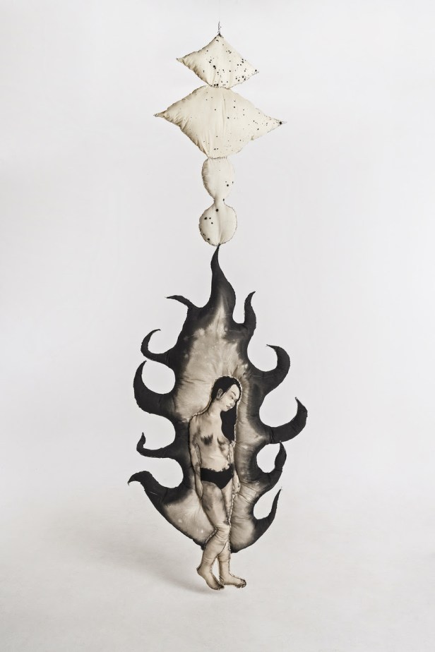 «Il ricamo è da sempre antico custode della memoria, narra storie silenziose e intime di generazioni passate cucendo i frammenti del tempo con pazienza e maestria – spiega la curatrice Maria Vittoria Baravelli – Sang A Han riprende la pittura orientale tradizionale e l’antica arte tessitoria coreana per creare un linguaggio creativo contemporaneo e performativo. Attraverso l’uso del Meok, del pennello, dell’ago, del filo e del tessuto di cotone, crea sculture morbide che rimandano alla natura, al corpo e ai sogni, e intesse la sua vita frammentata di donna, artista e madre in un lavoro fatto di tanti piccoli attimi che ritaglia e cuce. Ne nascono delle opere da cui emerge un lirismo magico, una linea sinuosa che lega il corpo al luogo dei desideri, dei misteri e dei sogni e disegna un confine delicato tra il paesaggio naturale e quello anatomico».