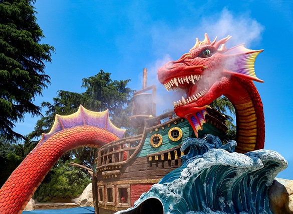 Il drago Marino, apparentemente avvinghiato ad un vascello pirata, in realtà lo salva da un naufragio sicuro, creando un’area acquatica di 350 metri quadri, ricca di scivoli, giochi e zampilli. Come se non bastasse, dopo aver superato le spericolate discese delle Rapide dei Draghi, i piccoli possono scoprire il luogo segreto dove nascono queste maestose creature, osservare le uova pronte a schiudersi e conoscere da vicino due draghi appena nati: Spino e Artiglio.