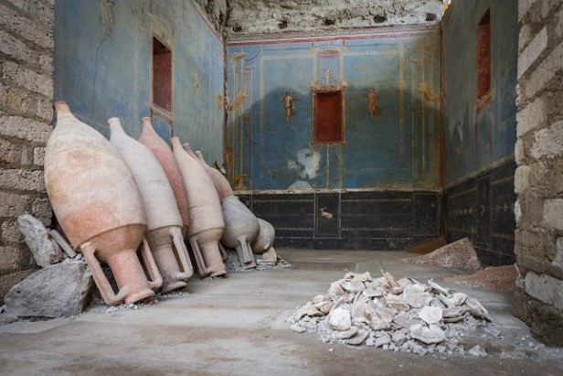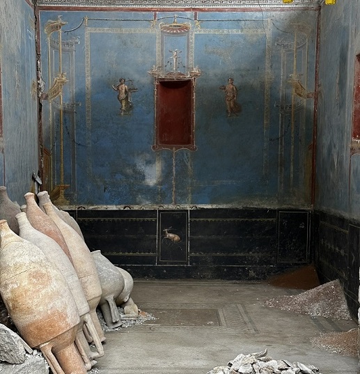 È stato pubblicato sull’e-Journal degli Scavi di Pompei un approfondimento su un nuovo ambiente scavato nell’area centrale della città antica, dipinto in blu e interpretabile come un sacrarium, ovvero uno spazio dedicato ad attività rituali e alla conservazione di oggetti sacri.