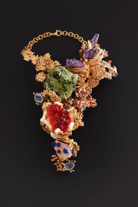 Fra i molti gioielli in mostra è opportuno citare la collana Stone Reef, dove il dialogo fra le madrepore della barriera corallina modellate in bronzo e le pietre che nascono nelle viscere della Terra, risulta davvero interessante, grazie anche alla bellezza e rarità dei minerali utilizzati; la collana Pappagalli, con gli uccelli svolazzanti coperti di smalti colorati, le immense foglie tropicali in bronzo dorato, ma soprattutto la grande malachite, un minerale di un verde intensissimo che ricorda, per forma e colore, il cuore pulsante e profondo della selva amazzonica.
