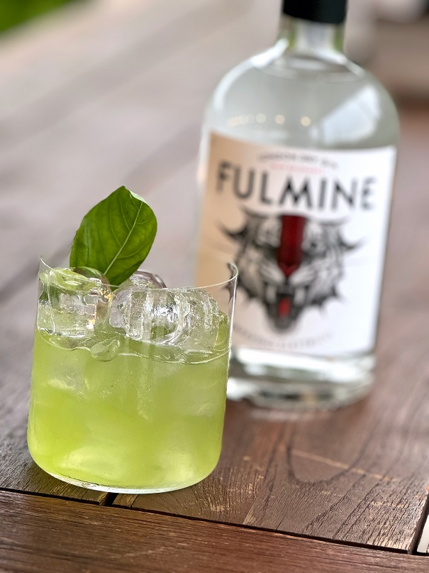 gin fulmine, sciroppo di zucchero, lime, basilico fresco
