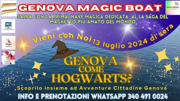 Per celebrare la città di Genova si è pensato di ideare una nuova avventura sul mare, che unisce turismo e trasporto avvalendosi del battello e creando cosi’ la prima “Genova Magic Boat”: che salperà per fare ammirare a maghi e streghe di ogni età la Superba dal mare con incantesimi dal mare di sera! Si partirà con la prima data il 13 luglio 2024.