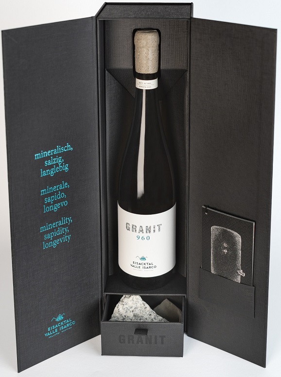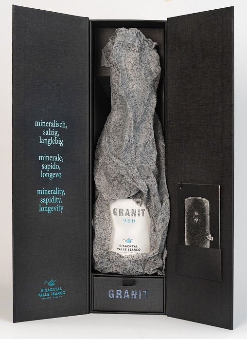 Anche il branding e il design di Granit 960 mirano a comunicare la storia e l’unicità di questo Kerner: il design dell’etichetta e della confezione è di altissimo pregio, suscita curiosità, ma soprattutto trasmette il legame del vino con la sua origine e il suo metodo di produzione.