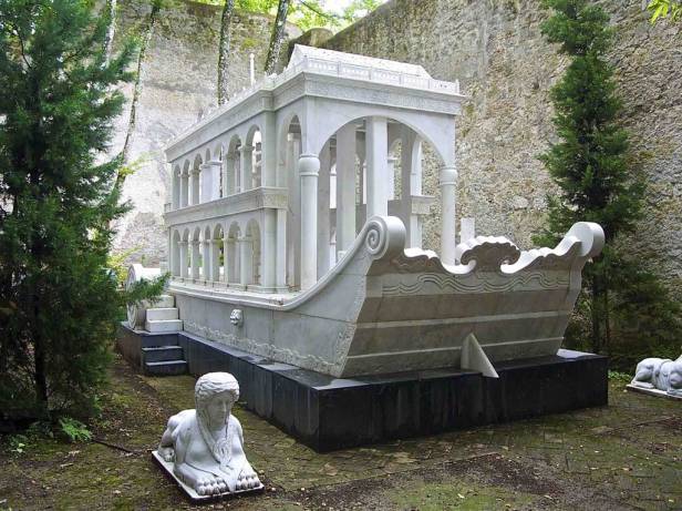 Rimanendo in tema e spostandosi dopo Rieti, il centro storico di Rivodutri ospita un arco solitario ornato di strane sculture ed iscrizioni, posto di fronte ad un piccolo giardino, completamente estraneo agli edifici circostanti: ecco la Porta Alchemica, che leggenda sia legata alla pratica delle cosiddette scienze occulte. Ci sarebbero infatti incise indicazioni preziose per la trasformazione in oro di ogni materiale o per l’elevazione spirituale allo stadio nobile dell’individuo vile. I simboli planetari sono associati ai metalli, piramidi, cerchi, iscrizioni in latino ed ebraico e una stella a sei punte, il sigillo di Re Salomone. Nella Porta Alchemica ricorrono molti dei simboli classici della cultura esoterica, tra cui spicca la figura di Mercurio (Hermes), primo agente della Pietra Filosofale,.Di tutt’altra storia la nave imperiale cinese che si scorge tra gli alberi del primo bosco didattico del Lazio. All’interno della Tenuta di Sant’Egidio si erge imponente uno splendido monumento marmoreo, copia perfetta della nave imperiale, ridotta in scala 1:3, costruita nel 1895 per il 60° compleanno dell’imperatrice della Cina tuttora ancorata sulle sponde del lago Kunming, nel Palazzo Imperiale d’Estate a Pechino. La sua esotica presenza tra gli alberi della Tuscia si deve all’incontro, negli Anni Sessanta, del noto imprenditore Eugenio Benedetti con l’Ultimo Imperatore Pu Yi, grazie al quale consolidò un’intensa collaborazione per l’estrazione di marmo pregiatissimo sui monti Hebei e Honan aprendo in territorio cinese 34 cave. In occasione del suo 75° compleanno Benedetti ricevette 100 tonnellate del marmo bianco, utilizzato cosi per la costruzione della nave e la sua collocazione è davvero particolare, all’interno delle mura dell’antica Chiesa della Santissima Trinità che è sprovvista di tetto.
