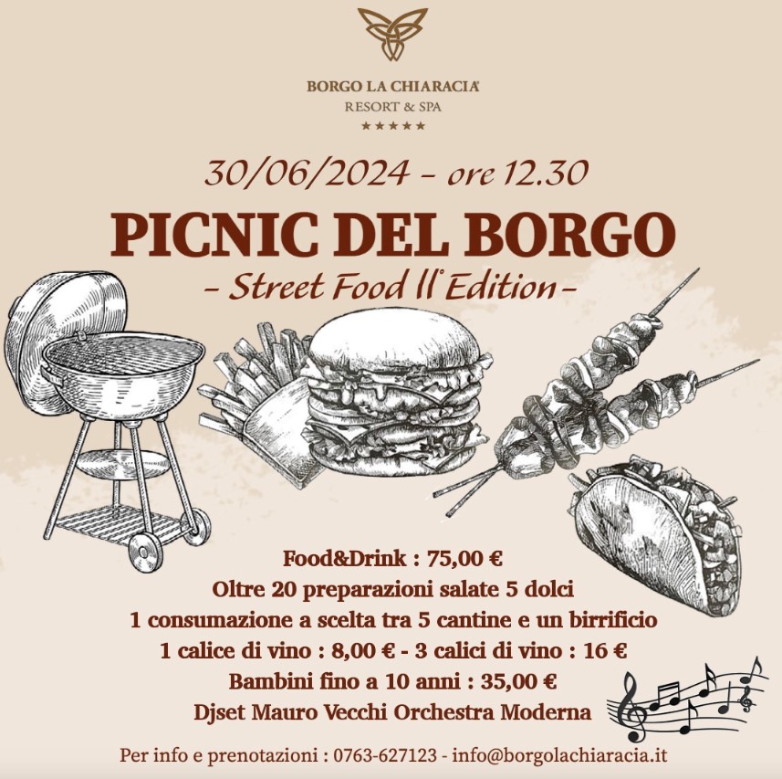 Una giornata dedicata alla golosità e alla scoperta di specialità enogastronomiche, accarezzati dall’ombra di querce e castagni secolari, un appuntamento in chiave street food firmato dall’Executive Chef Daniele Auricchio per aprire le porte all’estate. La musica dal vivo e lo scenario dell’Altopiano dell’Alfina faranno da sfondo ai banchi d’assaggio dove gustare preparazioni espresse, ottimi vini e birra del territorio, l’appuntamento da segnare è domenica 30 giugno a Borgo la Chiaracia Resort & SPA, a partire dalle 12.30.
