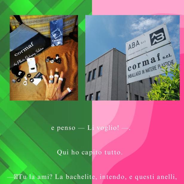 - Maria la lucentezza della bachelite rimane tale nel tempo — mi dice Chiaveri, e rivedo il lampo insolito degli anelli mentre scivolavano sul tavolo, il lampo amoroso nei suoi occhi, ma anche nei miei — li amo! (lui), li voglio! (io) — poesia, voluttà… —.