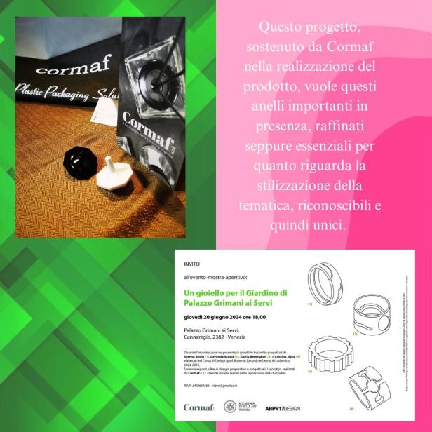 Torniamo ora Cormaf, a Riccardo Chiaveri, alla bachelite, al progetto “Un gioiello per Il Giardino di Palazzo Grimani ai Servi, in collaborazione con l’accademia delle Belle Arti di Venezia.