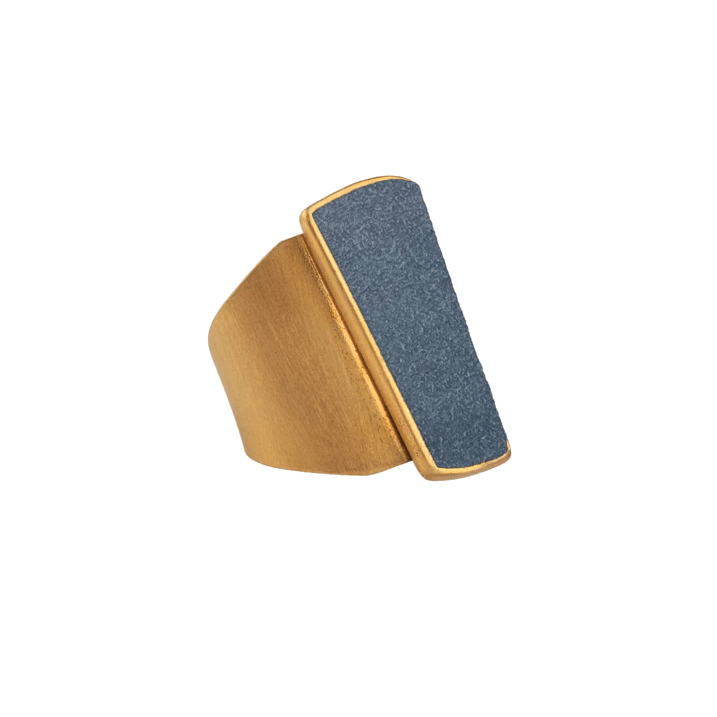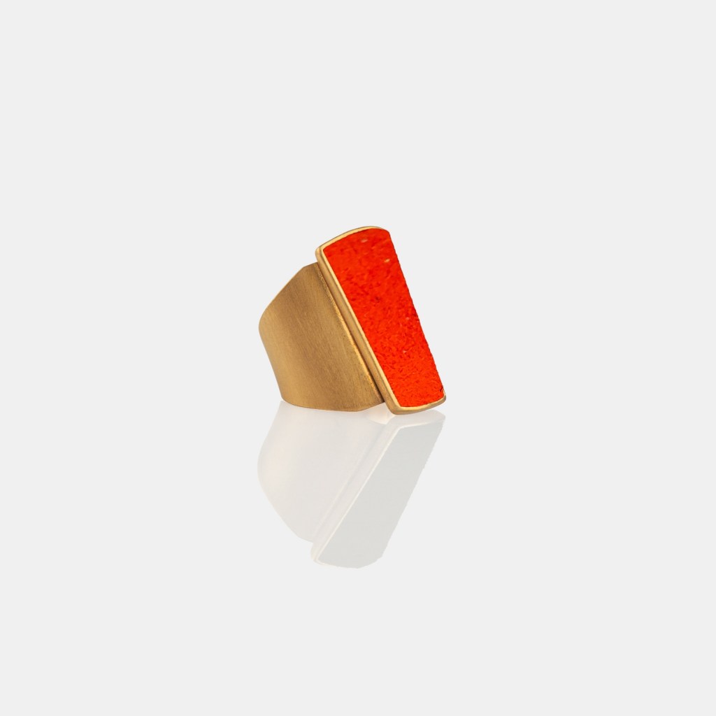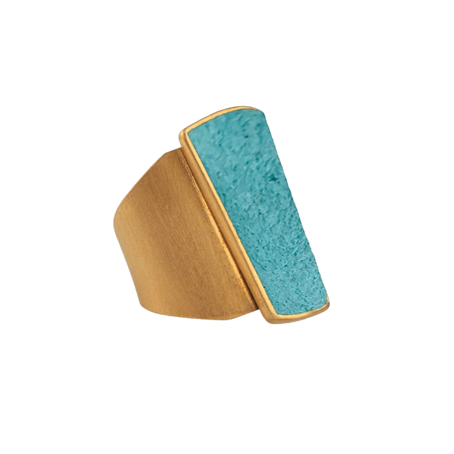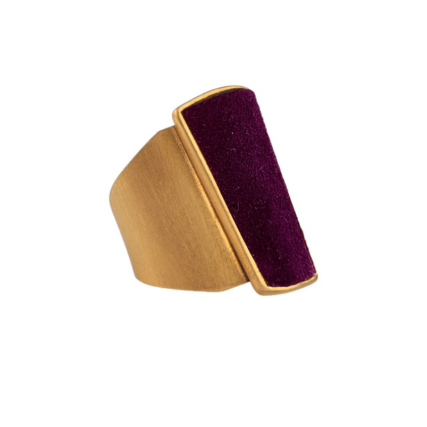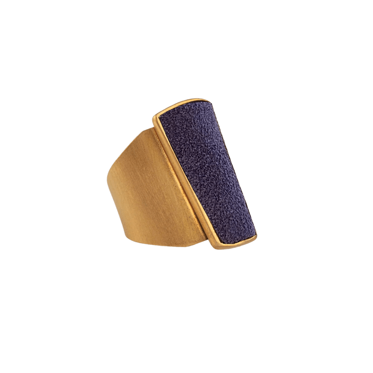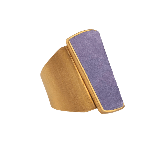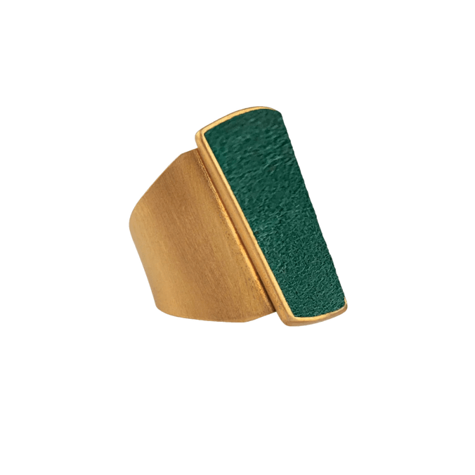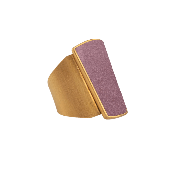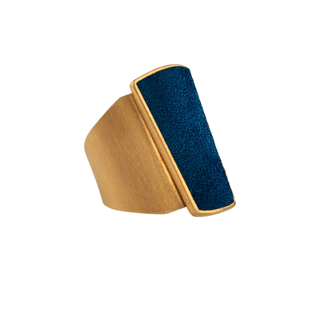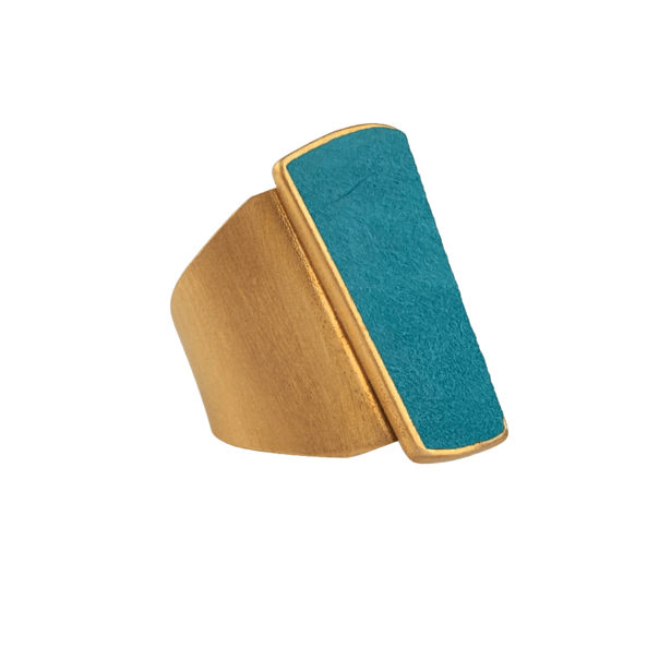 L’anello Danea, realizzato in ottone bagnato nell’oro, cattura l’attenzione con la sua esplosione di colori che ricordano un arcobaleno infinito. Il camoscio, incastonato in un cameo a forma geometrica, si declina in una palette vibrante: turchese, jeans, giallo, lilla, corallo, magenta, verde acqua, blu scuro, viola, nero, bordeaux e petrolio. Ogni nuance racconta una storia, ogni riflesso evoca un’emozione.