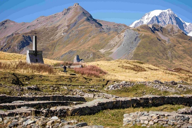 Successivamente, furono i Romani a costruire una strada che collegava la capitale imperiale (Milano) con la capitale delle Gallie (Lione), una via che divenne un capolavoro di architettura romana in Valle d’Aosta. A simboleggiare la presenza romana sul Colle del Piccolo San Bernardo, la Colonna di Giove, alta quattro metri e visibile anche a grande distanza, sulla quale è stata eretta la statua di San Bernardo di Mentone, arcidiacono di Aosta, e le rovine di due “Mansiones” che garantivano ristoro e pernottamento ai viaggiatori e agli animali già nel I secolo a.C., antenate dell’Ospizio fatto erigere da San Bernardo stesso intorno al 1.100 d.C., rimasto attivo come casa ospitaliera fino alla Seconda Guerra Mondiale. Oggi la struttura ospita l’Ufficio Internazionale di Informazioni Turistiche e il Museo della Storia del Colle, della Valdigne e della Savoia.