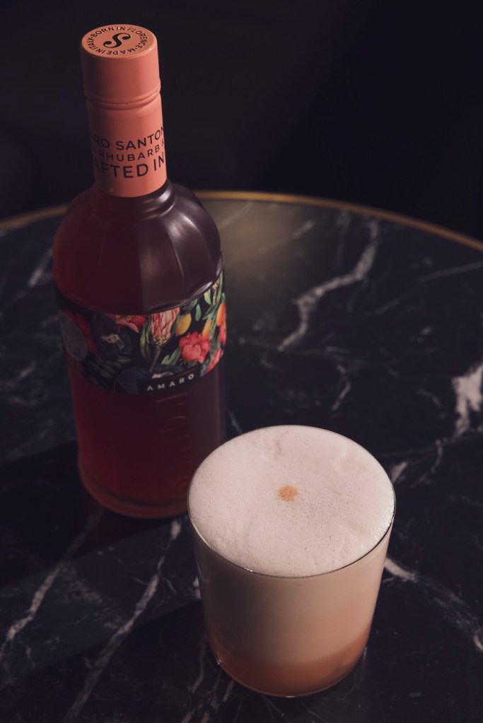 Ingredienti: 40 ml Santoni, 20 ml Rum giamaicano invecchiato, 25 ml succo di limone, 10 ml Ss1 e 10 ml di albume.