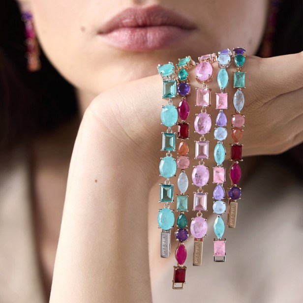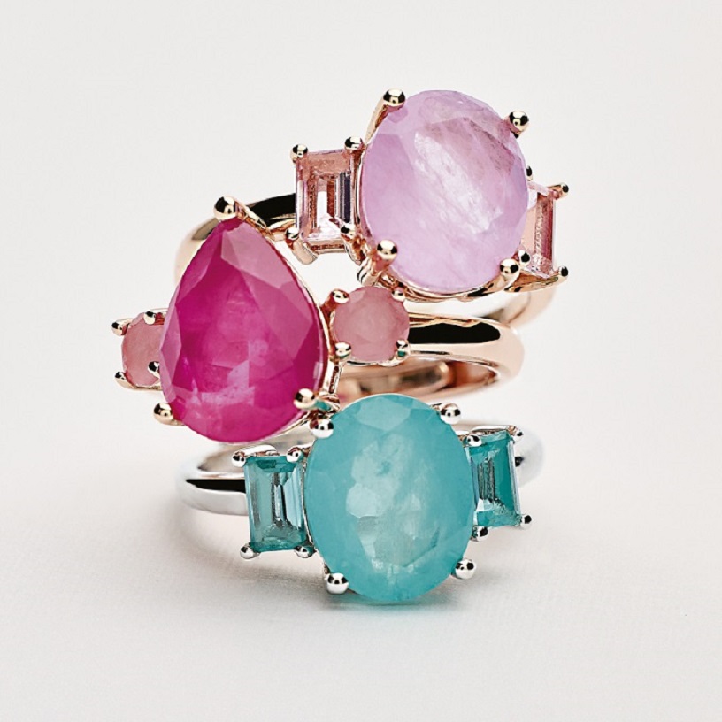 Ogni gioiello, in argento rodiato o placcato oro rosa, è composto da gemme con tagli differenti (baguette, ovale, goccia, navette) mixate per farsi ammirare, ma anche per confondere e rapire gli sguardi.