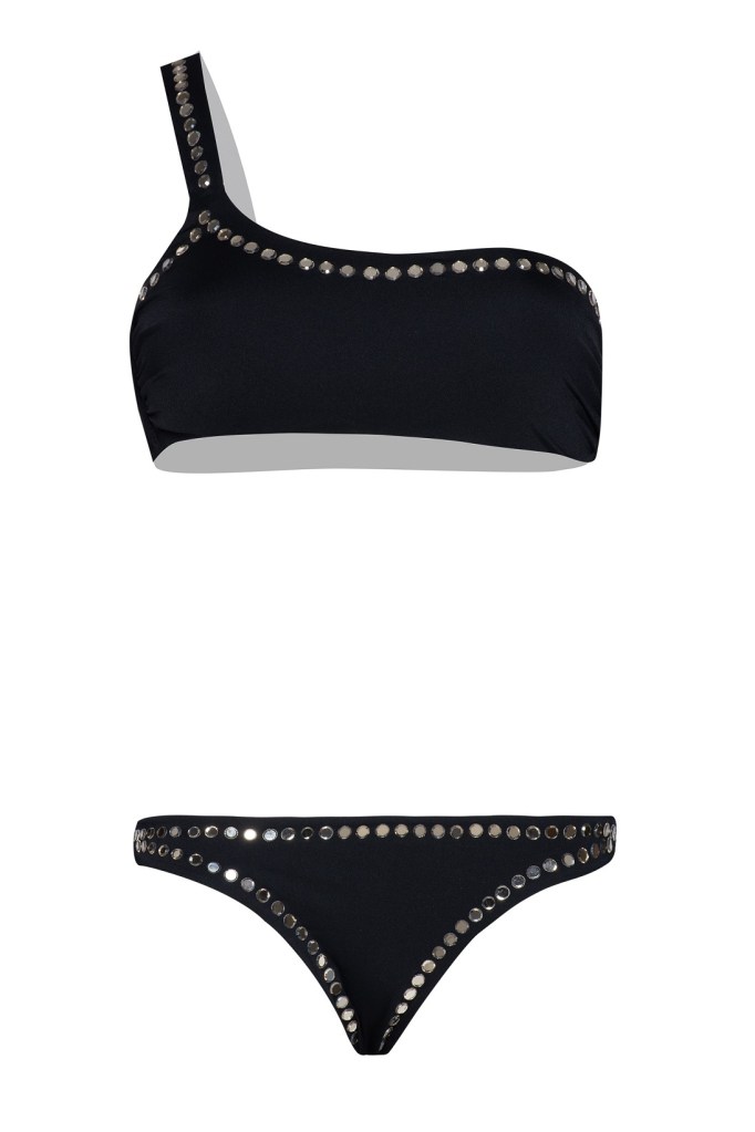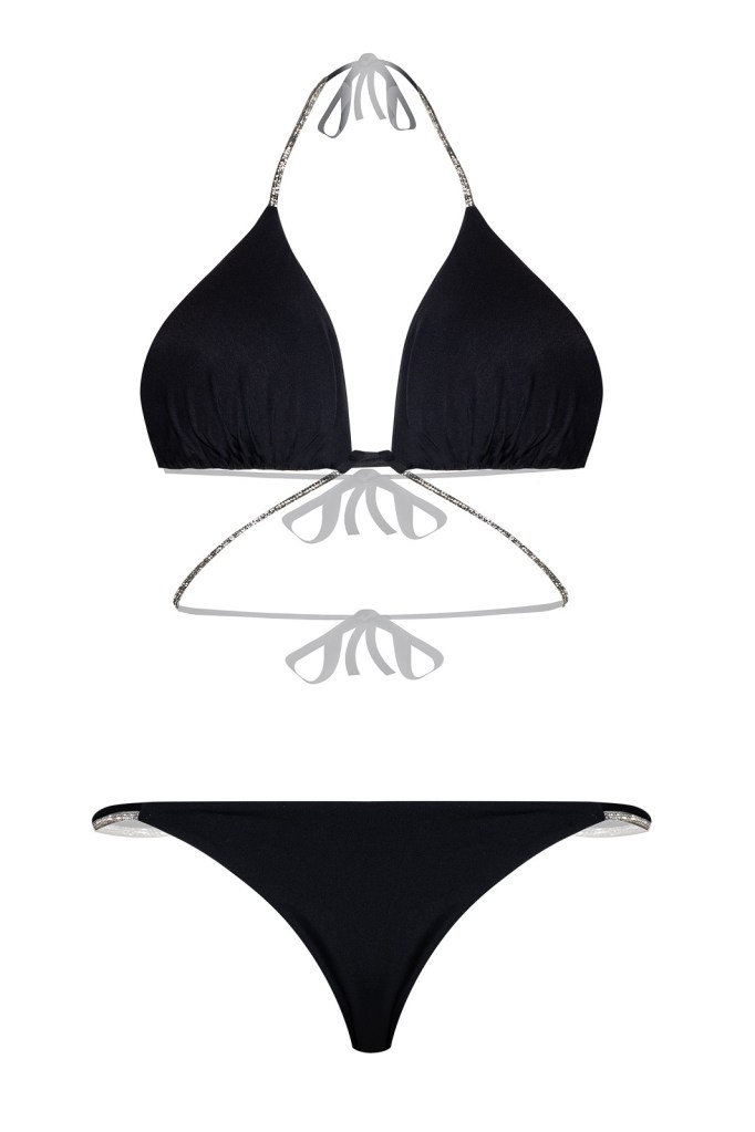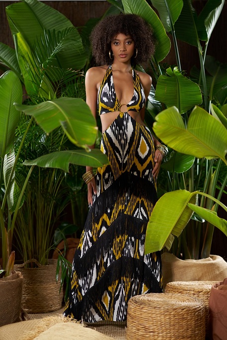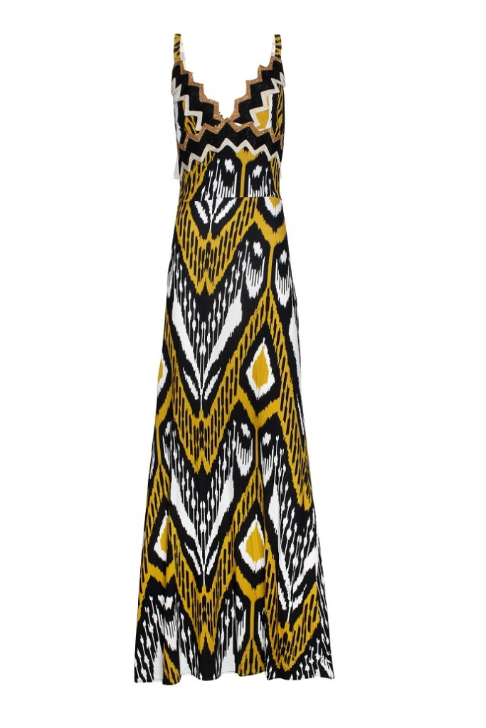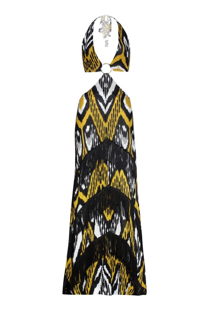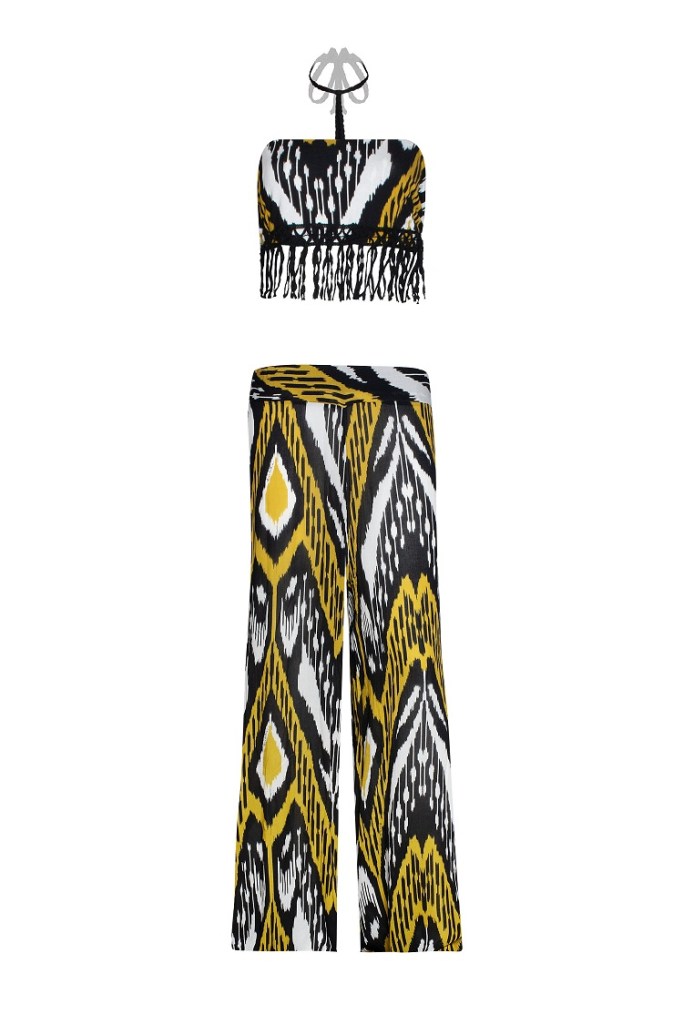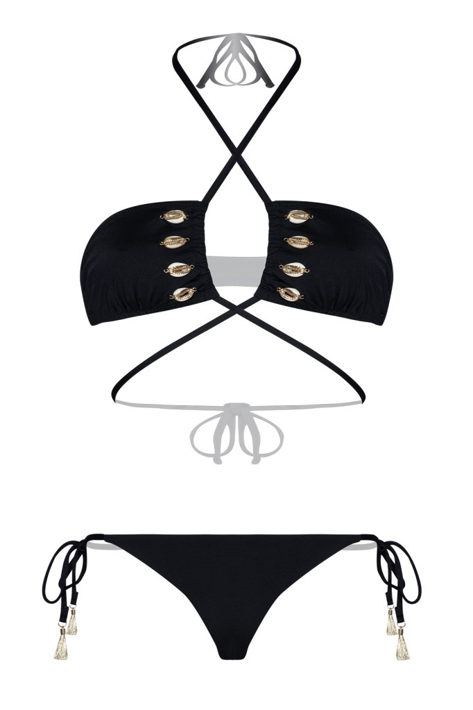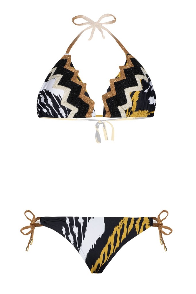 Stampe, dunque, in primo piano che si arricchiscono con un affascinante motivo ikat in ocra e oro, protagonista dell’essenziale bikini a triangolo vivacizzato da charm nappina e da applicazioni cacobochon in perfetto stile tribale.