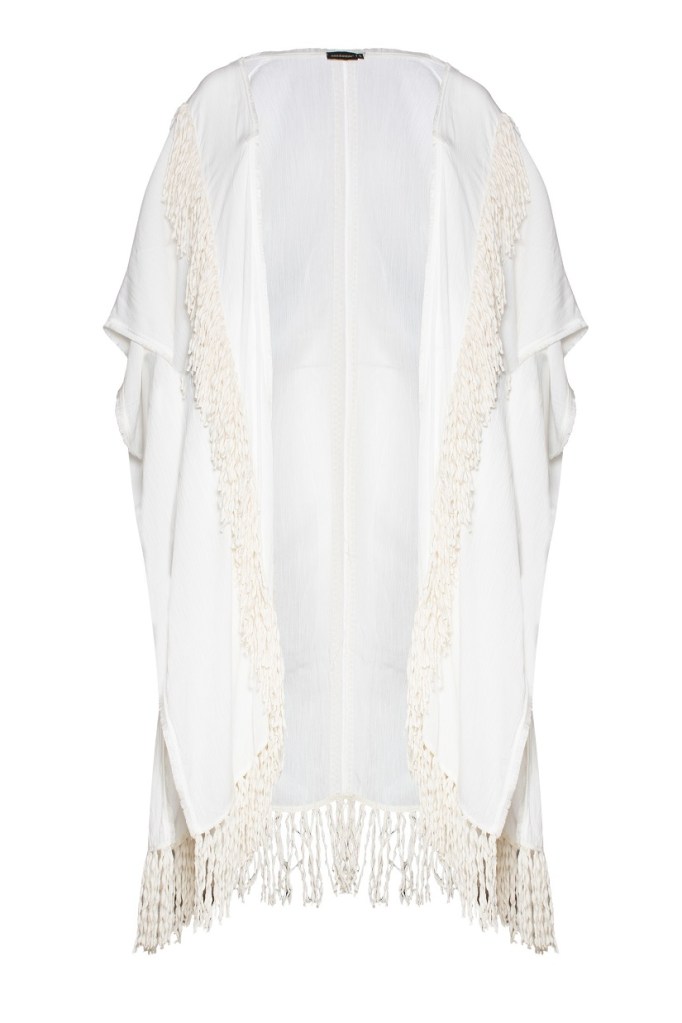 Che si completa con il kimono etno-chic con frange scomposte dall’effetto wow, perfetto anche per il long dress con foulard ton sur ton per notti zingare e appassionate.
