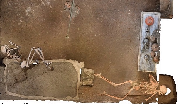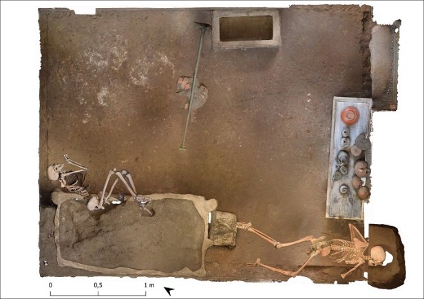 Si tratta di un uomo e una donna con un piccolo tesoro di monete e ornamenti preziosi. Le impronte nella cenere hanno permesso di ricostruire gli arredi e individuarne l’esatta posizione al momento dell’eruzione: un letto, una cassa, un candelabro in bronzo ed un tavolo con piano in marmo, con la suppellettile in bronzo, vetro e ceramica ancora al suo posto.