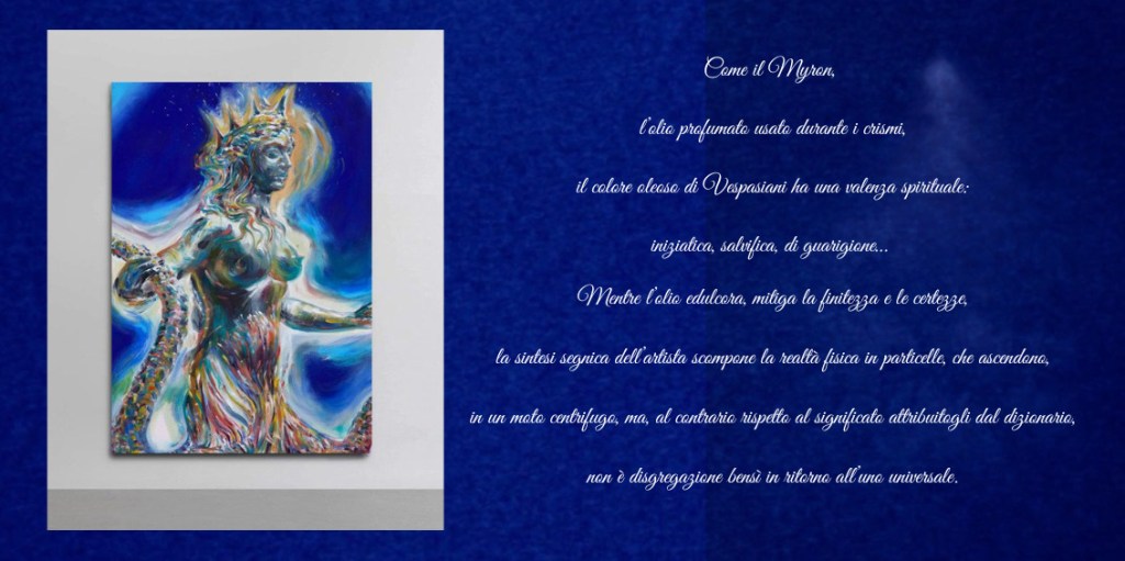 Come il Myron, l’olio profumato usato durante i crismi, il colore oleoso di Vespasiani ha una valenza spirituale: iniziatica, salvifica, di guarigione…