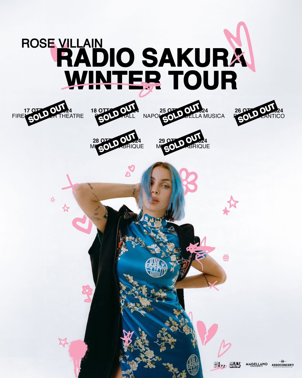 Mancano pochi appuntamenti alla fine del tour estivo, che ha portato Rose Villain quest’estate nei festival di tutta la penisola, ma l’artista sta già pensando all’imperdibile tour nei club in cui “RADIO SAKURA” avrà una vita live unica e speciale, per le sei date del “Radio Sakura Winter Tour” tutte già sold out. Queste le date indoor e outdoor, prodotte e organizzate da Magellano Concerti, Me Next e Next Show.