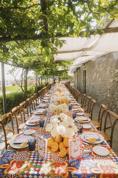 Circondati dai profumi degli alberi di limone che impreziosiscono la location, gli ospiti hanno gustato un menù speciale scelto dagli sposi, ricco di ingredienti tipici della cucina italiana: pomodori di Sorrento, mozzarella di bufala e basilico, simboli indiscussi della Costiera Amalfitana.