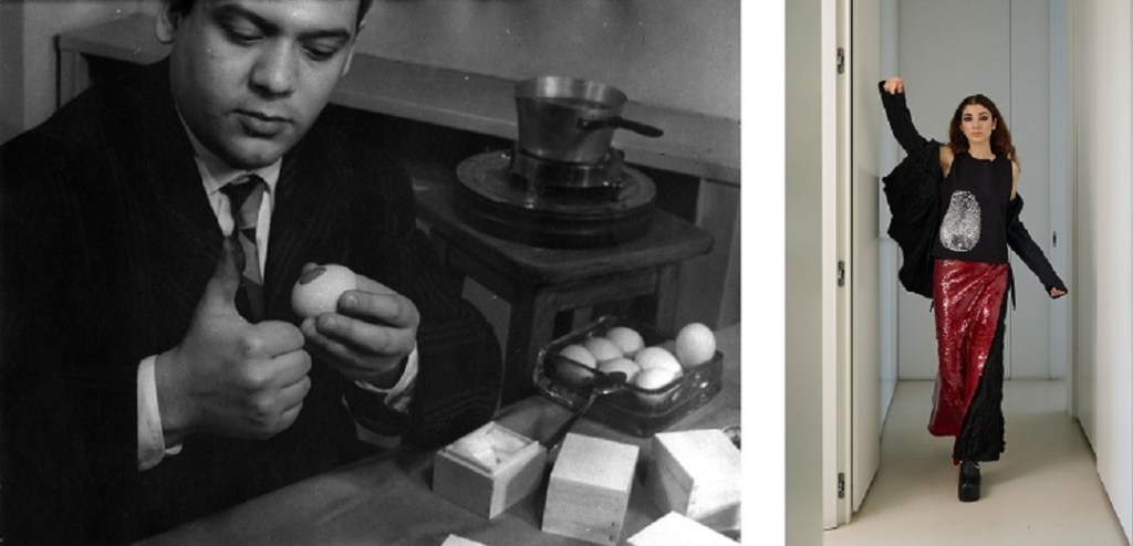 L’impronta ripresa da Maria Calderara come stampa su gonne, camicie, canotte riporta alla luce quella traccia che l’artista ha lasciato nell’arte, ed è tradotta nei gioielli in una somiglianza formale con le celebri uova con l’impronta digitale presentate dall’artista nel 1960 nella mostra Consumazione dell’arte Dinamica del pubblico Divorare l’arte presso la galleria Azimut. Similmente la firma stampata ad hoc su ogni pantalone è un richiamo al gesto stesso del firmare, un gesto che Manzoni compie nell’azione del 1961 intitolata Sculture viventi in cui apponeva la propria firma sul corpo di modelle in carne ed ossa per farne un’opera d’arte viva, in movimento.