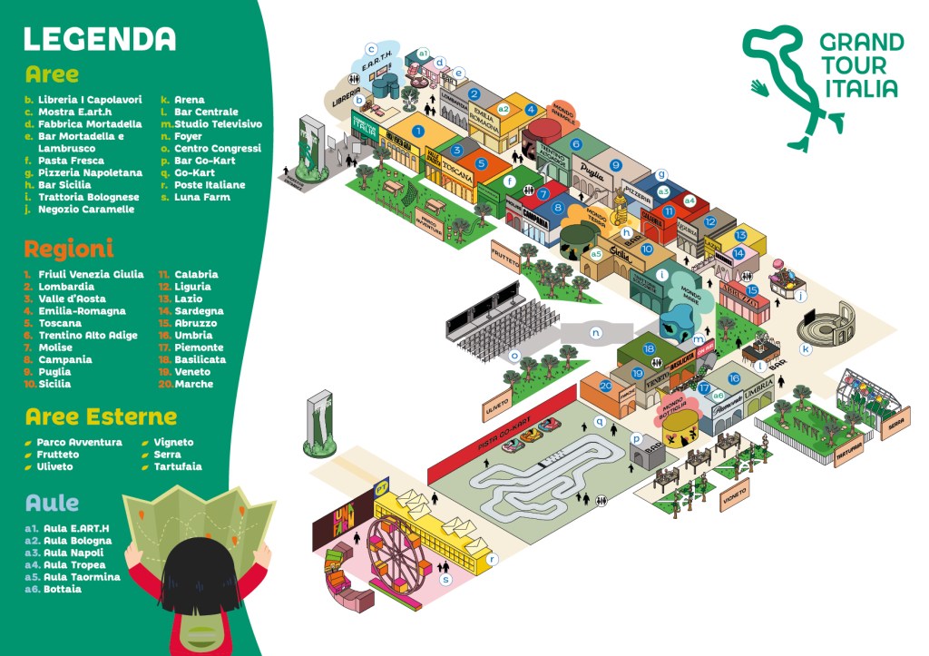 Ogni regione avrà uno spazio dedicato che comprenderà un’area paesaggistica e di promozione turistica, un’osteria tipica, un mercato con prodotti regionali e un’area didattica. Ad alcuni partner di rilievo come la Scuola Holden, Coldiretti e Slow Food è stata affidata la narrazione di storia, cultura, agricoltura e biodiversità enogastronomica.