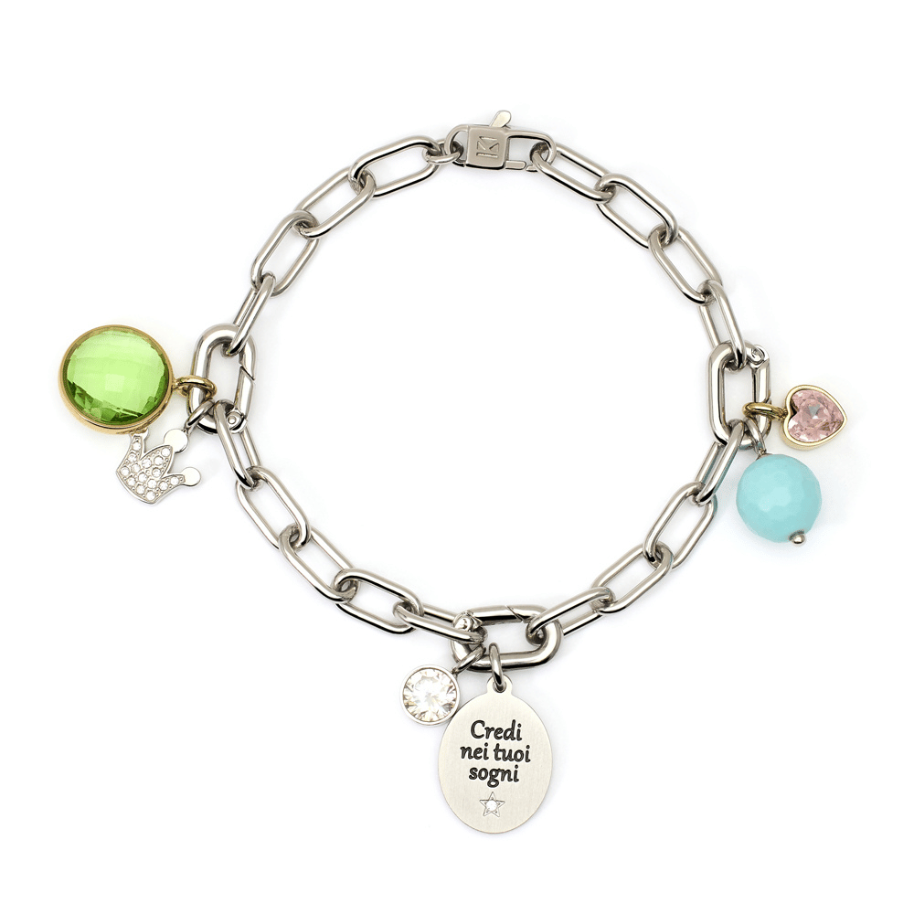 Oppure puoi alzare le mani al cielo e scatenarti facendo tintinnare i tanti charm su cui Kidult ha inciso delle brevi e potenti citazioni, perfette per chi adora l’atmosfera dei concerti dal vivo, come per esempio “Vivi tutta la vita che puoi” o “Credi nei tuoi sogni”. Perché non è detto che prima o poi tu non riesca a incontrare il tuo cantante preferito o – ancora meglio – a realizzare ogni tua aspirazione!