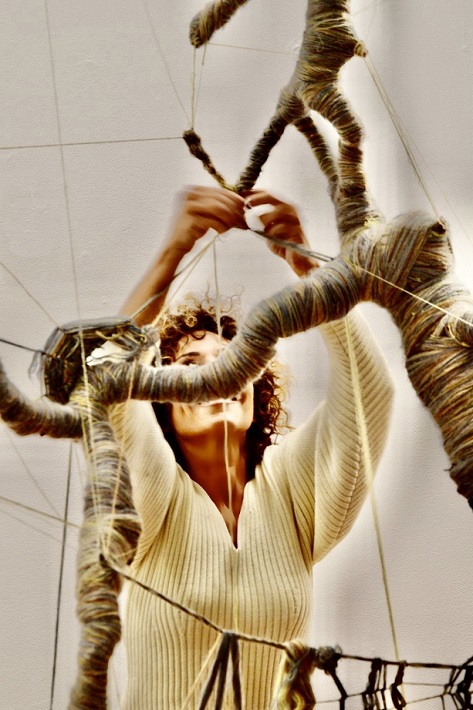 GLORIA CAMPRIANI – Nata e cresciuta a Certaldo nel laboratorio artigianale tessile di famiglia, Campriani possiede una formazione multidisciplinare che passa attraverso lo studio delle lingue, della pedagogia, del teatro e dell’arte. Ha lavorato per anni in aziende che collaborano con i migliori brand di moda internazionali e i suoi primi maestri vanno ricercati fra i designer con i quali è entrata in contatto durante la sua attività professionale. Queste esperienze si sono rivelate, più tardi, determinanti nella scelta dell’utilizzo del filo come uno degli strumenti principali del suo percorso artistico. La familiarità con questo materiale, infatti, ha facilitato le capacità espressive e dopo un’analisi basata sul confronto di vari materiali ha ritenuto il filo, per la sua flessibilità, lo strumento più idoneo per le sue forme espressive.