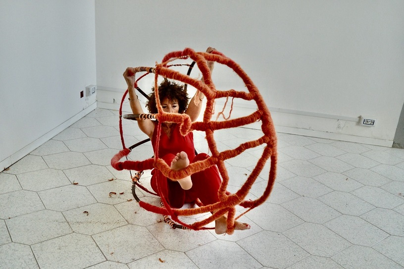 “Nella performance intitolata ‘Nuovi equilibri’ – scrive Gloria Campriani – metto in evidenza le tensioni, la fatica, le difficoltà, la rabbia, che incontro durante il mio percorso e che mi impediscono, insieme allo ‘strumento’ instabile, con cui mi muovo, il raggiungimento di un equilibrio che sembra impossibile da ottenere. I conflitti che si generano durante il tragitto, anche di natura pratica, fra l’interno e l’esterno di una ‘vecchia carcassa’, non ti permettono di andare avanti. Io ondeggio come se fossi una barca in mezzo al mare mi spingo da una parte all’altra perché non ho abbastanza spazio all’interno. La struttura della ‘scultura’, con cui mi muovo e che mi ospita e contemporaneamente mi protegge è così instabile che mi impedisce di raggiungere l’insperato. Vacillo ma non mollo”.
