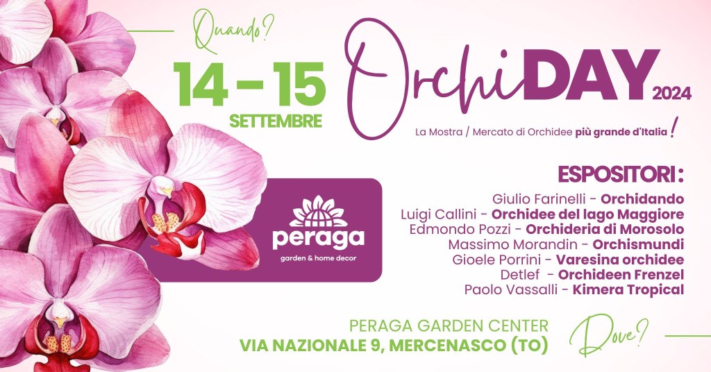 Sabato 14 e domenica 15 settembre, dalle 9 alle 19, presso il Peraga Garden Center in Via Nazionale 9 a Mercenasco (TO), torna una delle fiere di orchidee più prestigiose d’Italia: OrchiDay.