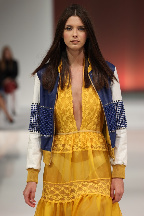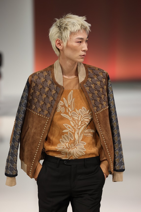 In passerella 33 look donna e 13 proposte uomo, outfits con sofisticate lavorazioni, giubbotti e felpe di pelle iper ricamati con cristalli e fiori hippie dipinti a mano con manifatture certosine che rispecchiano i dettami dell’alta moda e del vero Made in Italy.
