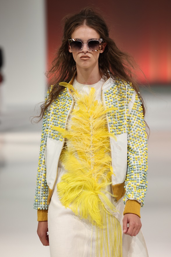 Gli abiti da gran sera hanno gonne importanti, da ballo, con centinaia di merletti e frange e i mini dress sono ricamati. Il giallo e l’arancio sono i colori predominanti della collezione, nuance ispirate all’estate e alla Costa Azzurra.
