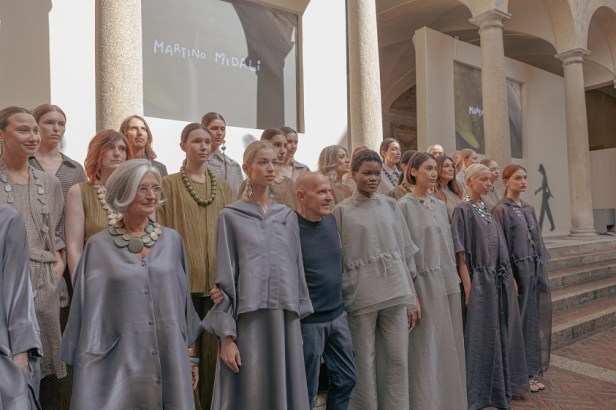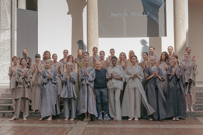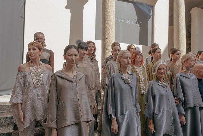 Uno stile per donne autentiche, le stesse che scelgono di vestire Midali nel quotidiano e che lo indossano in passerella accanto alle modelle per amplificare il senso di un messaggio che celebra l’amore libero e la pace universale fin dalla performance iniziale affidata ai danzatori de La Compagnia Ormaslab orchestrati dalla coreografa Ornella Sberna.