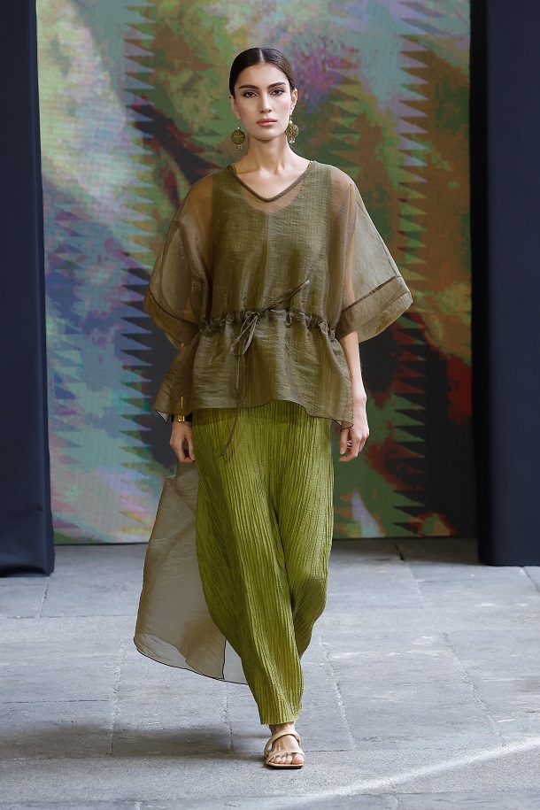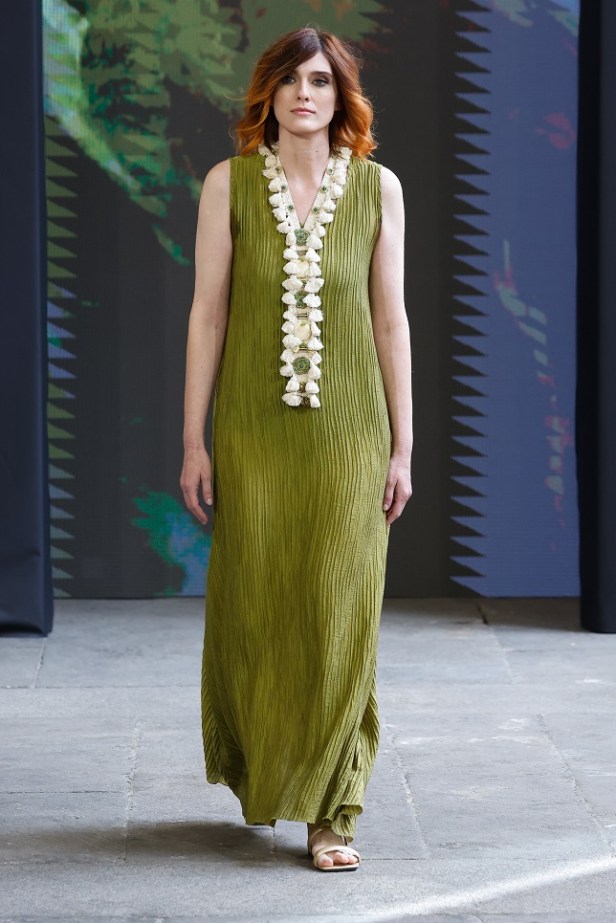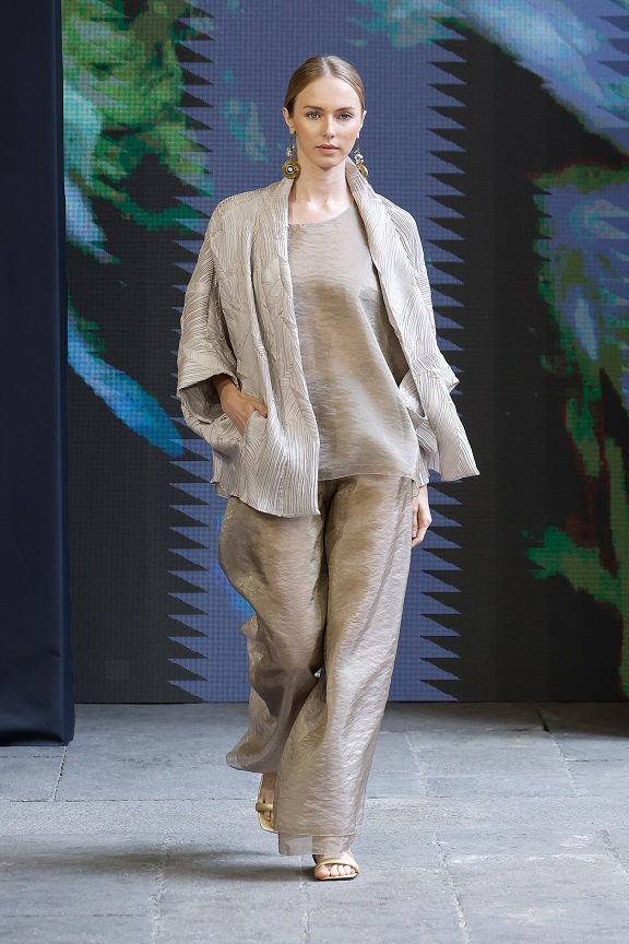 Un paesaggio naturale da portare sulla pelle che regala un’esperienza immersiva e tattile perché i tessuti si toccano e si esplorano accarezzandone la superficie che accoglie lavorazioni d’autore che li dinamizzano con effetti tridimensionali generati dai giochi irregolari di increspature, tra texture plissettate e goffrate.