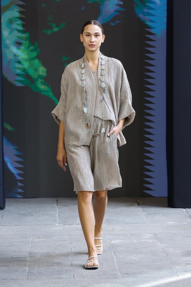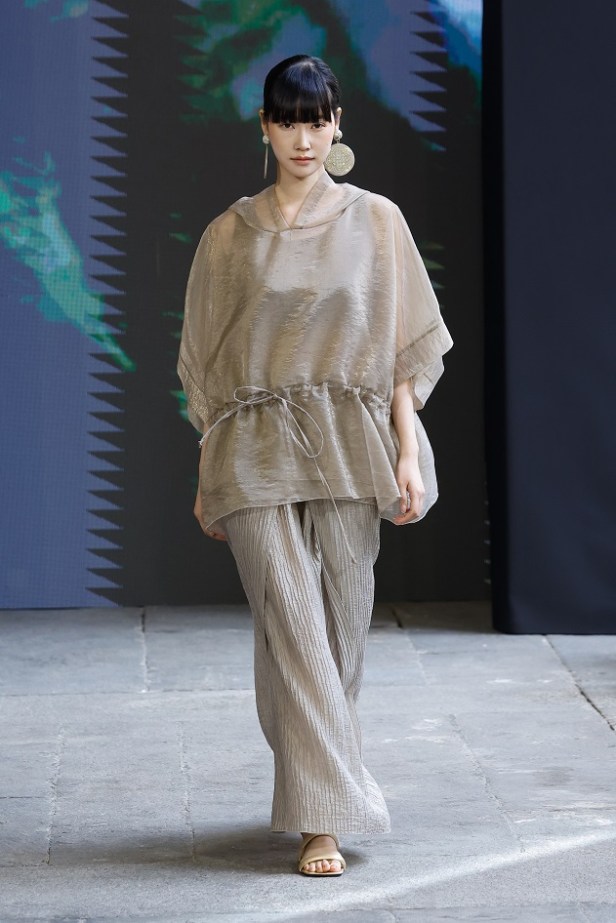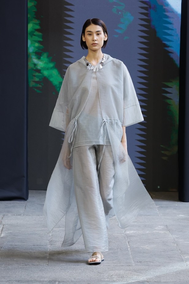 Un concentrato di luminosità che appartiene al tessuto laminato iridescente, da cui prendono vita capi agili da miscelare, tra bluse senza maniche e casacche di volume, panta-palazzo, bermuda e abiti midi a trapezio, scamiciati oversize e cardigan con cappuccio, dove giocano i dettagli, come la raffinata allacciatura alla coreana.