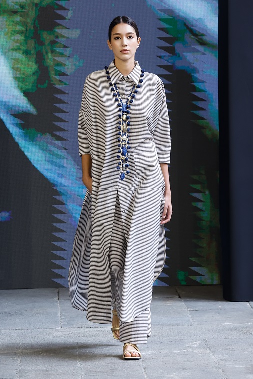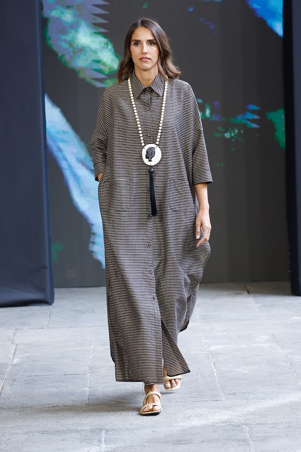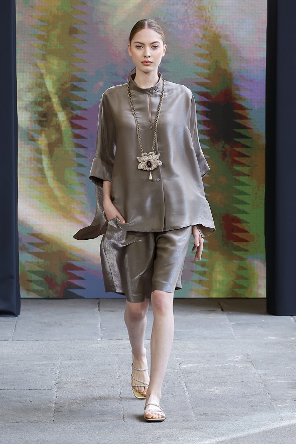 I codici di Martino Midali si connettono artisticamente con la materia regalando effetti inediti: nelle ampie bluse che si allungano su morbidi pantaloni o si aprono sugli abiti midi e lunghi a trapezio; nelle camicie over da portare anche sovrapposte e con struttura materica a contrasto, su pantaloni alla caviglia.