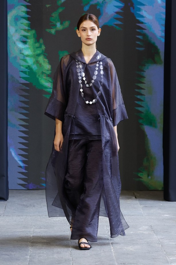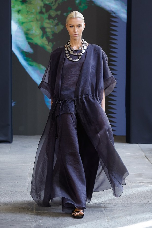 E ancora spazio al mix di finiture opache e lucide che enfatizzano la profondità e la ricchezza dei tagli, completati da capi in organza mossa in dialogo con le trasparenze negli spolverini e nei poncho con coulisse e sugli imprescindibili caftani.