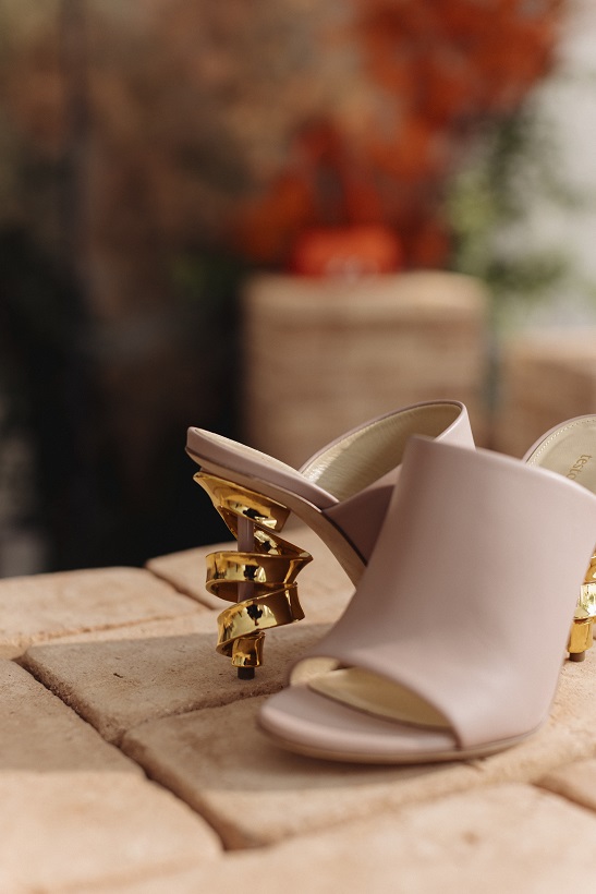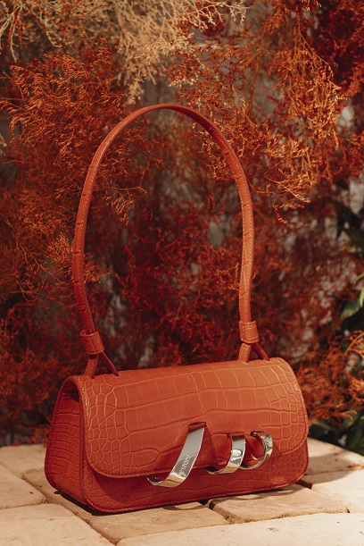 La borsa “Amedeo”, dedicata al fondatore Amedeo Testoni, e realizzata in pelle di alligatore e presenta dettagli scultorei a spirale, una reinterpretazione contemporanea della rivoluzionaria tecnica di lavorazione delle scarpe a spiral ideata da Testoni.