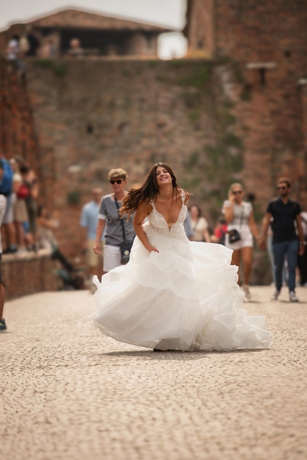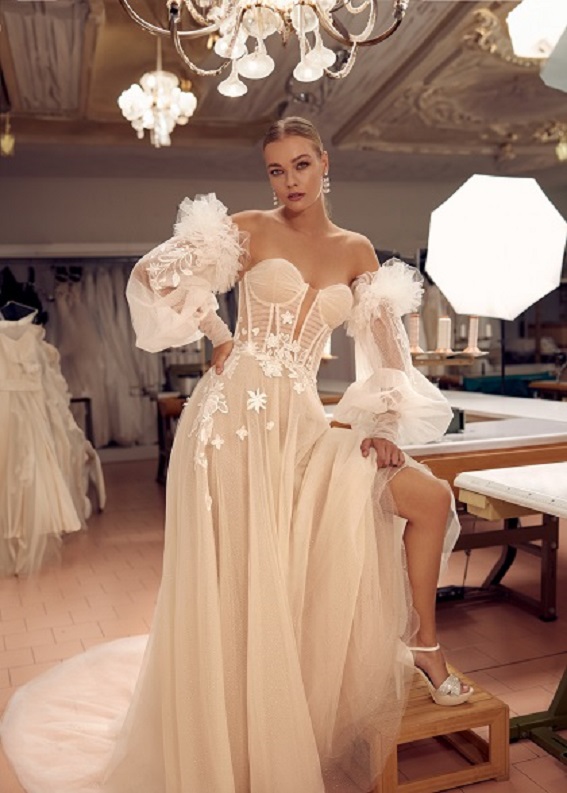 Un tocco di glamour e personalità viene aggiunto da dettagli intricati, come ricami, perline, fiori tridimensionali e fiocchi. Non solo bianco per la sposa, sono molte le tonalità proposte per chi vuole spiccare e per un contrasto giocoso e originale anche gli abiti candidi sono spesso presentati con dettagli dai colori intensi, come il viola, il verde smeraldo e il nero, con ogni look corredato dall’accessorio giusto. Per le spose più eteree linee scivolate in tulle o chiffon mentre le linee sensuali a sirena sono ideali per chi sceglie di essere più audace, sempre con tessuti ricercati ed elasticizzati che rendono la sposa comunque comoda di muoversi.