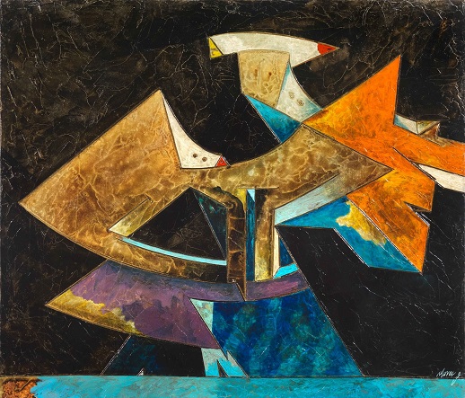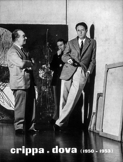 Gianni Dova (1925 -1991) nato a Roma, si trasferisce a Milano con la famiglia, dove frequenta l’Accademia di Brera, allievo di Carrà e Funi. Con alcuni dei suoi compagni, in particolare con Roberto Crippa, instaura un rapporto di collaborazione e profonda amicizia. Partecipa attivamente al dibattito culturale dei primi anni del dopoguerra, firmando nel 1946, insieme a Crippa, Morlotti, Tassinari e Testori, il Manifesto del realismo (Oltre Guernica).