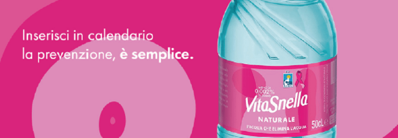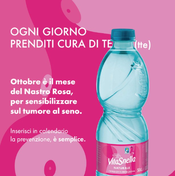 Anche quest’anno ottobre si tinge di rosa per l’annuale campagna di sensibilizzazione sul tumore al seno e Acqua Vitasnella – brand di Ferrarelle Società Benefit, impegnata nel sostegno delle persone e della comunità in cui opera – si conferma un’alleata perfetta quando si parla di benessere, schierandosi al fianco di tutte le donne nella lotta contro il tumore alla mammella. Per promuovere l’importanza della prevenzione, Acqua Vitasnella annuncia, per il settimo anno consecutivo, una speciale Limited Edition: la bottiglia da 0,5L di Acqua Vitasnella dedicata alla campagna Nastro Rosa promossa da Fondazione AIRC per la ricerca sul cancro sarà disponibile per tutto il mese di ottobre nei punti vendita della grande distribuzione.