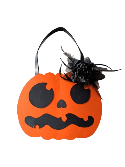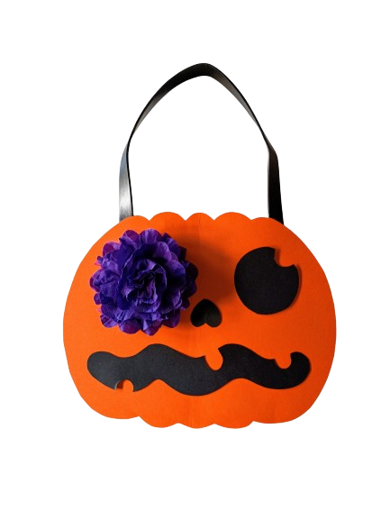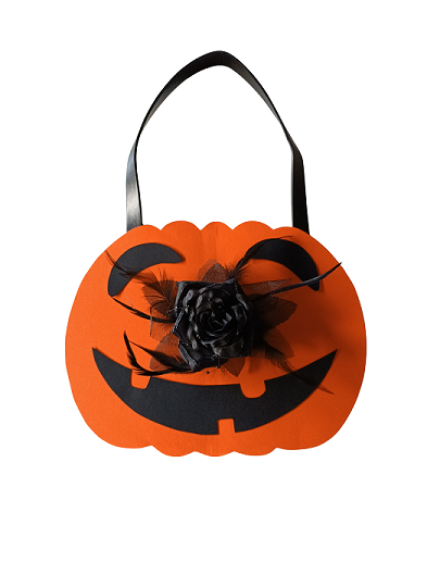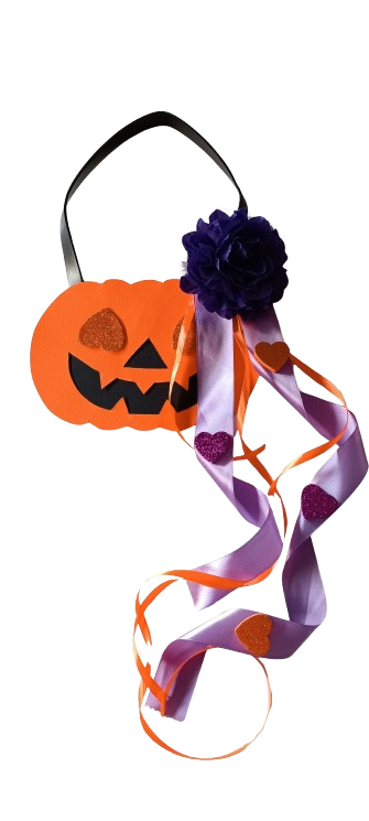 Quella che vedete nell’immagine è la MAGIC PUMPKIN, una borsetta che riprende la forma di una zucca. È lavorata con intaglio per naso e bocca, come occhi ha due grandi cuori, con la base in ecopelle e la superfice in plastica riciclata glitterata per dare quella tridimensionalità che essendo ultrapiatta altrimenti non avrebbe. Ha un grosso fiore laterale da cui parte un gioco di nastri, di colore e lunghezza diversi, alcuni dei quali hanno applicati cuori, di colore arancio e viola. I cuori, l’intaglio, il fiore e la borsetta sono interamente tagliati e cuciti a mano.