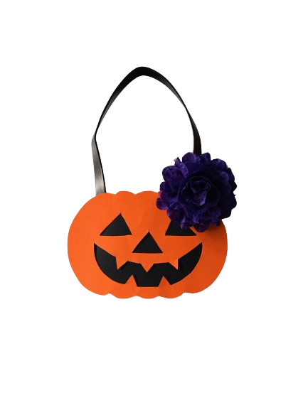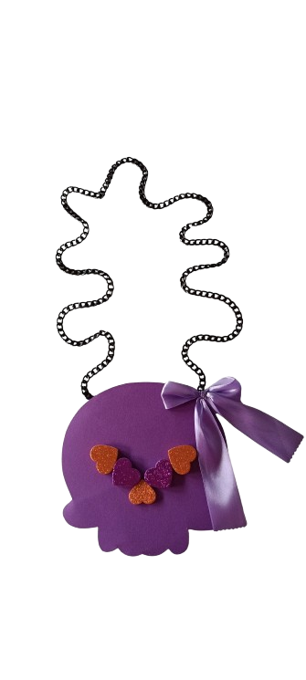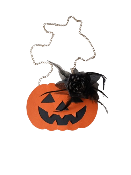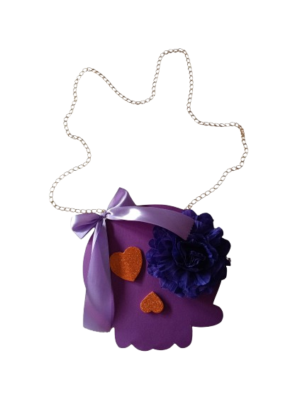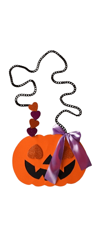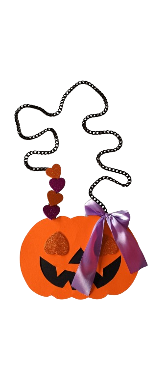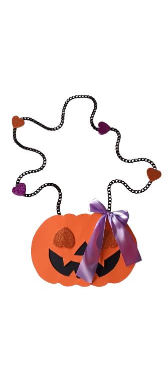 Quella che vedete nell’immagine è la ENCHANTED PUMPKIN, una borsetta che riprende la forma di una zucca. È lavorata con intaglio per naso e bocca, come occhi ha due grandi cuori, con la base in ecopelle e la superfice in plastica riciclata glitterata per dare quella tridimensionalità che essendo ultrapiatta altrimenti non avrebbe. È caratterizzata da un fiocco su di un lato ed una fila di cuori, di colore alternato, arancio e viola, applicata sull’altro. I cuori, l’intaglio, e la borsetta sono interamente tagliati e cuciti a mano.