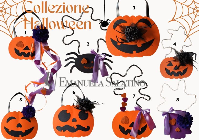 Per celebrare halloween la stilista ha realizzato una collezione di borsette, ultrapiatte, da giorno e da sera, in ecopelle, recuperata da un vecchio divano di colore zucca (of course), abbinata ad eco nera e viola, con elementi in plastica riciclata, fiori realizzati in eco e vari ornamenti recuperati qua e là.