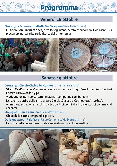 In occasione della Festa, venerdì 18 ottobre alle 20,30 all’Ecomuseo della Val Sangone al numero civico 1 di viale Italia ‘61 è in programma una serata intitolata “Quando don Gianni parlava, tutti lo seguivano”, dedicata alla figura di don Gianni Gili, precursore della valorizzazione della montagna e delle sue risorse. Nel pomeriggio di sabato 19 a partire dalle 14,30 è in programma al Circolo Chalet dei Cusinot al civico 72 di viale Italia ‘61 il ritrovo dei partecipanti alla CeuRun e alla quarta edizione della Ceurot Run, due corse-passeggiate non competitive per adulti e bambini lungo l’anello del Running Park Coazze.